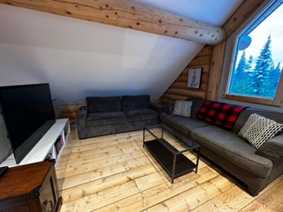 Our cozy cabin is 3 levels with three bedrooms, two full bathrooms, and additional